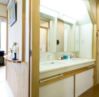 水まわり(洗面室・トイレ)玄関を上がり廊下に沿って洗面所とトイレがあります。忙しい朝の混雑を緩和するよう、明るく広い洗面台を2つ設置しました。向かいには清潔感あるトイレがあります。